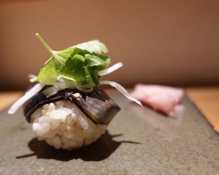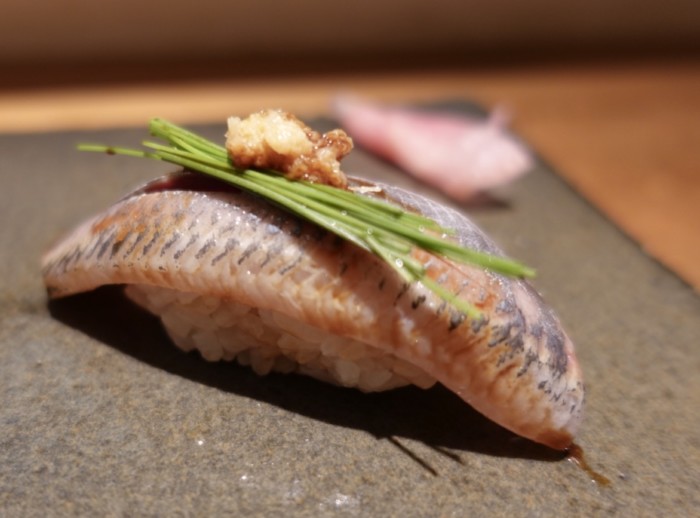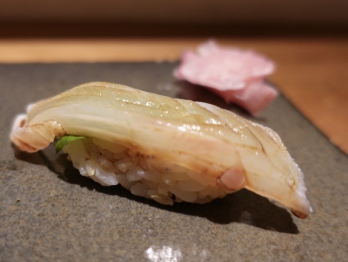 スズキ。中には大葉が敷かれ、スッとワサビが鼻から抜けて、プリッと引き締まったスズキにほろっと解けるシャリ。