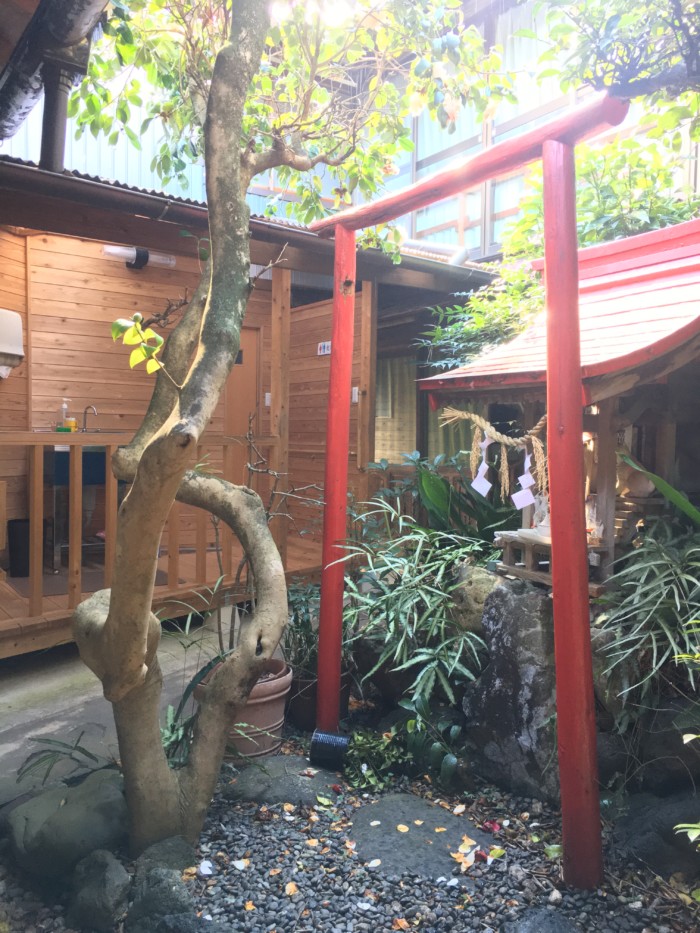 屋根ありの廊下を通り、その先にお手洗いがあります。なんと中庭に鳥居が!