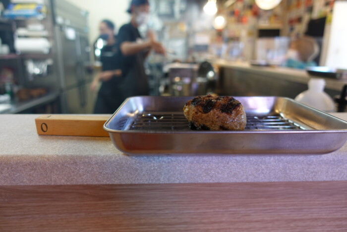 カウンターに置かれたトレイの上に焼き立てのハンバーグを置いてくれます。