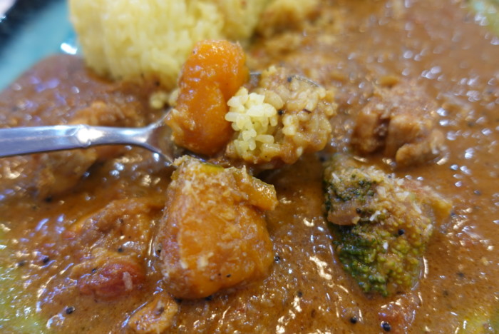 ココナッツの香りもしっかりします。チキンはとっても柔らかくて口の中で程よい弾力とほろっと繊維が砕ける中間の柔らかさ。この感じが大好きです・:*+..:+