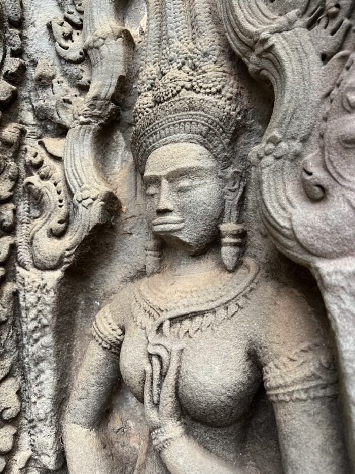 多くの寺院でよく見かけた女性の踊り子さんたち。一つ一つ表情が違います。時々面白いお顔の方もちらほら(笑)こちらの写真は、たらこ唇の可愛らしいお顔。笑った顔にするのはとても難しい技術なんだそうです。当時踊り子さんたちはたくさんのアクセサリーをつけて、かなり華やかだったことが記されています。