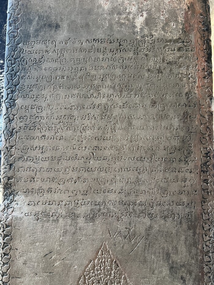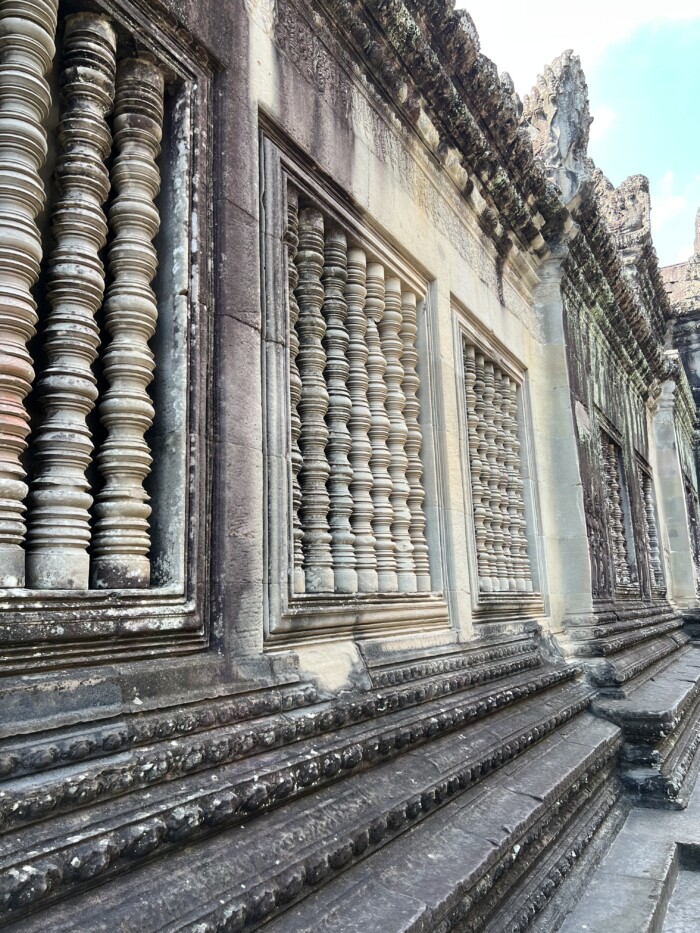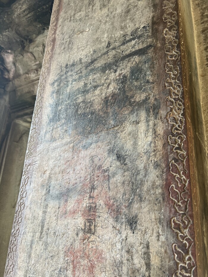 そしてこの柱にはまだ秘密があります。夕日が沈む少し前、外から光が入った時、この柱の影がアンコールワットのシルエットに見えるそうです。凹凸の一個一個が3つ綴りになっているのはそのためなんだとか。(きっと諸説あり)