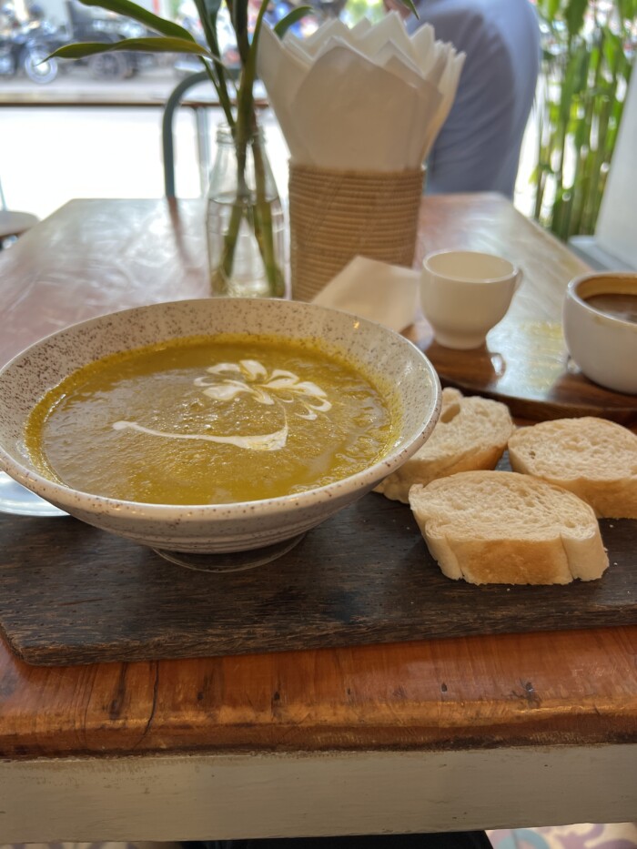 カボチャのスパイシースープを注文。これがとっても美味しくてまた食べたい。辛くないけれどいろんな香辛料が入っていて複雑な味。でも大まかに言えばカボチャカレーって味です。
